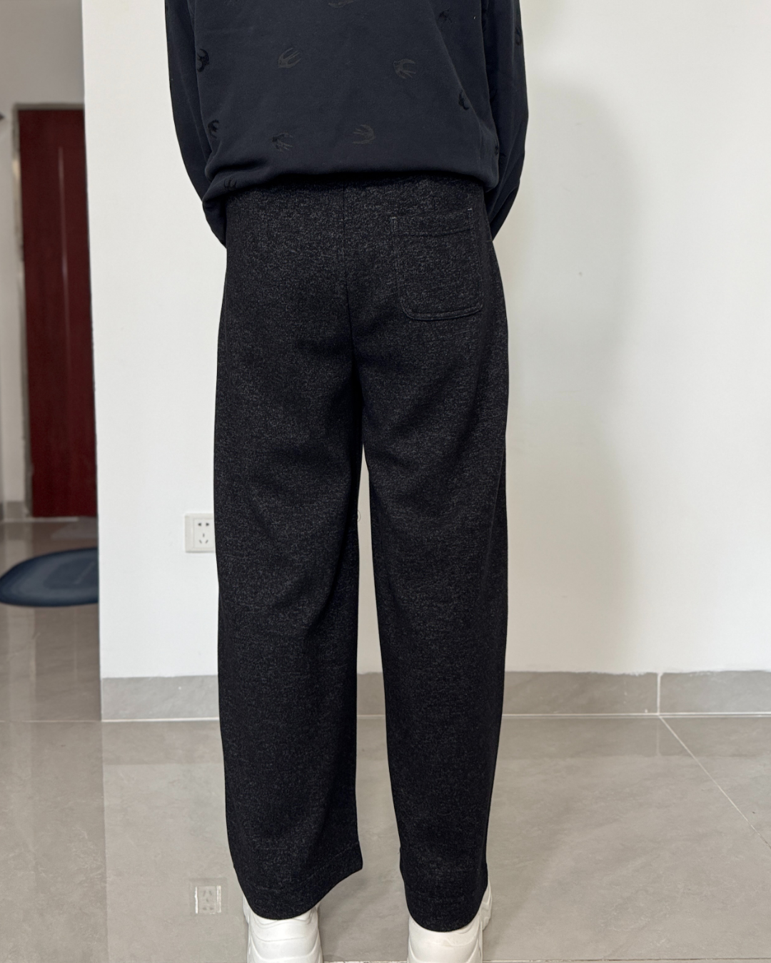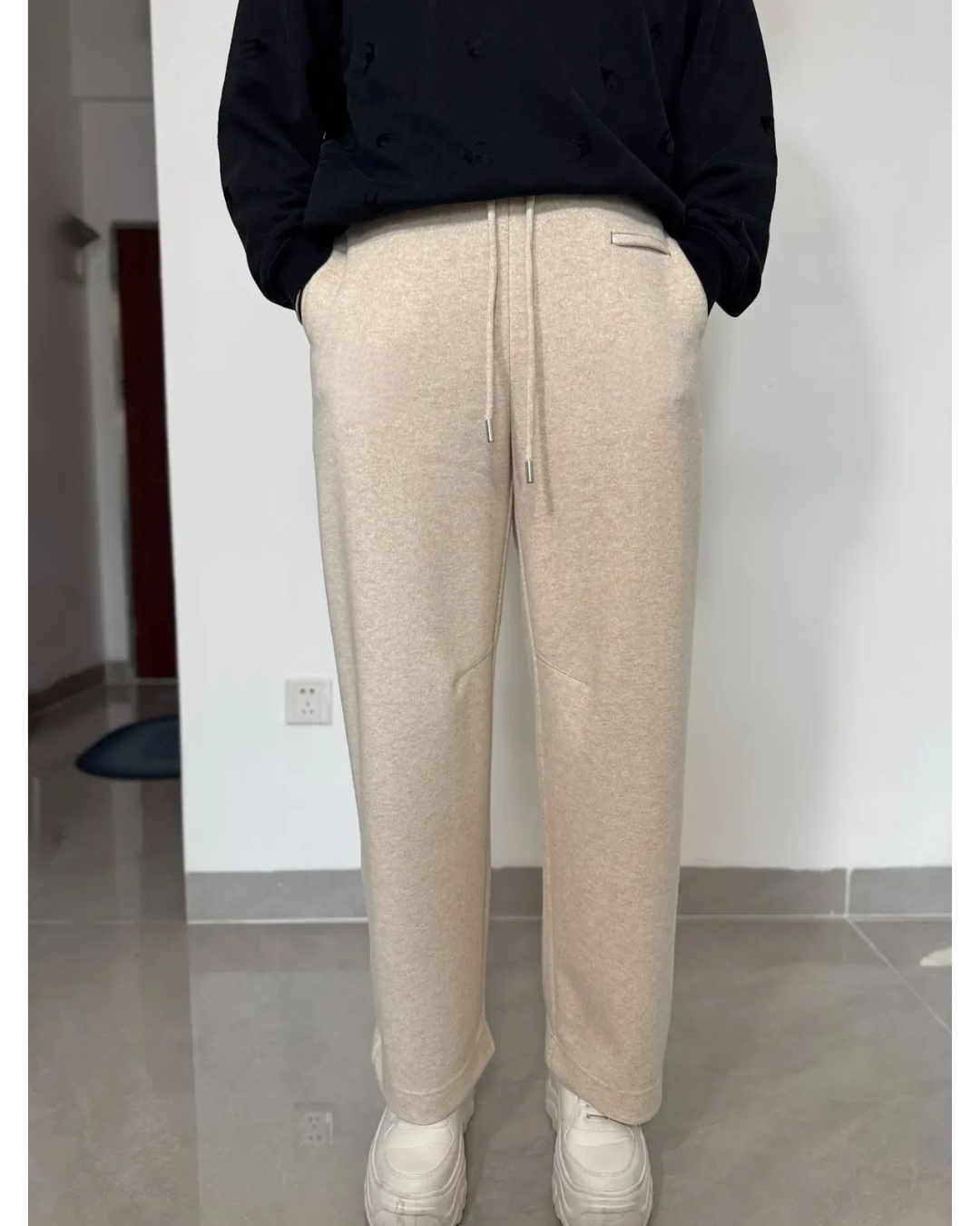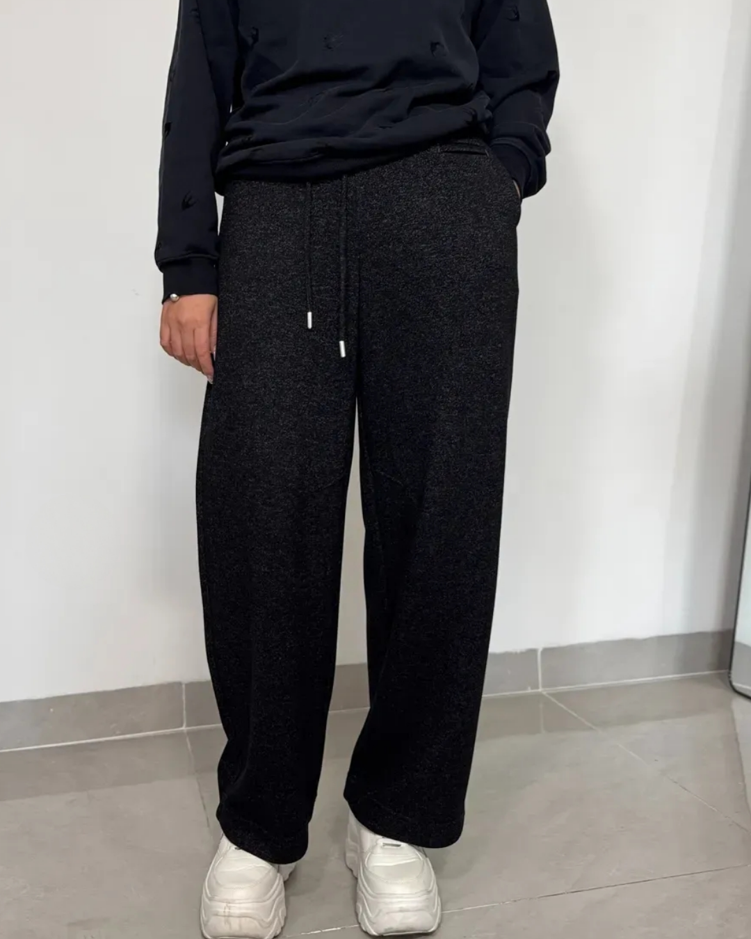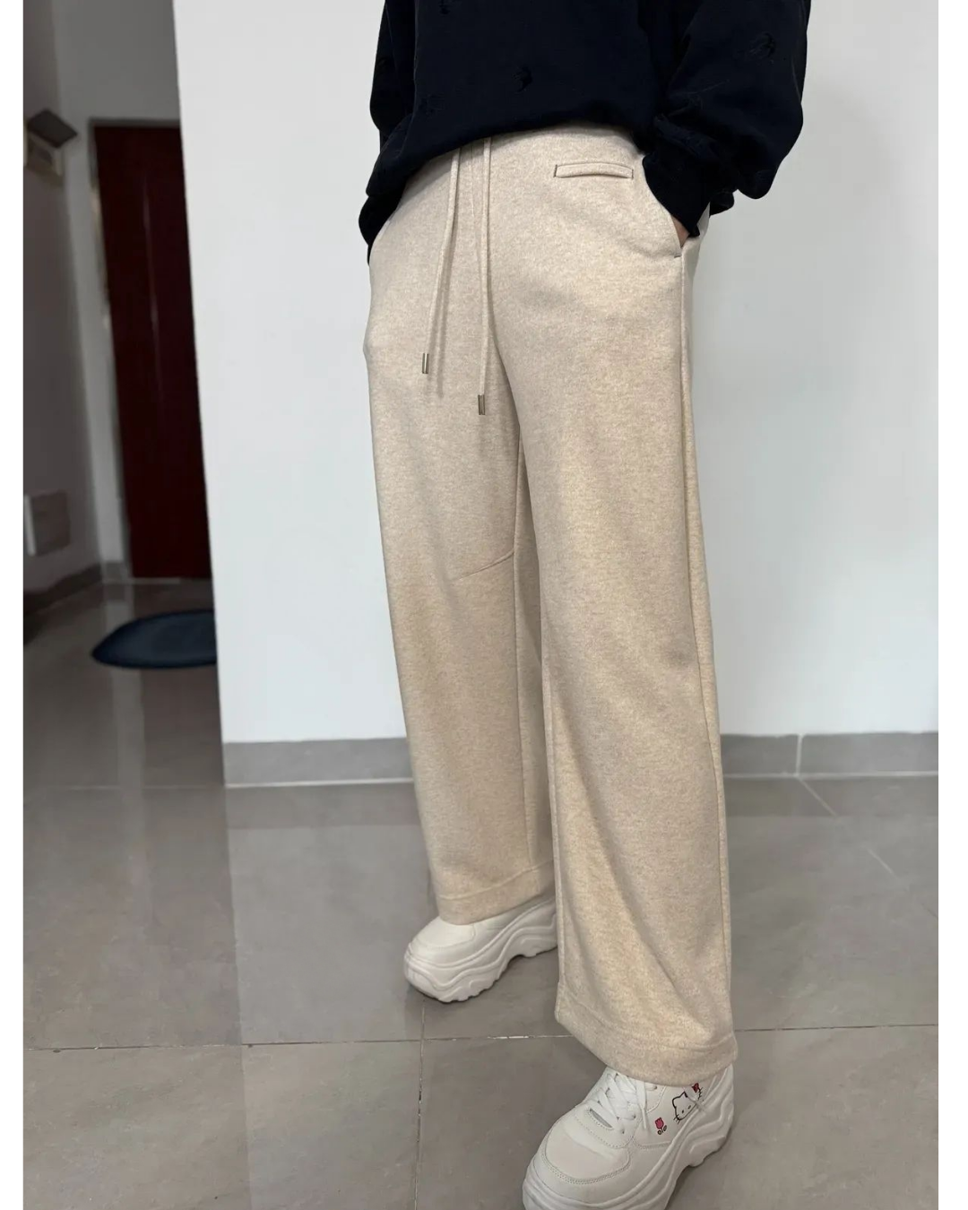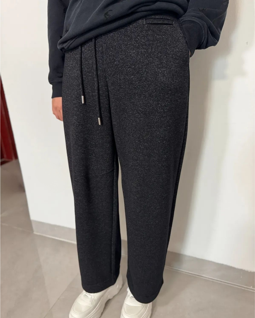 일자로 떨어지는 깔끔한 핏으로 홈웨어 느낌 없이 단정하게 연출